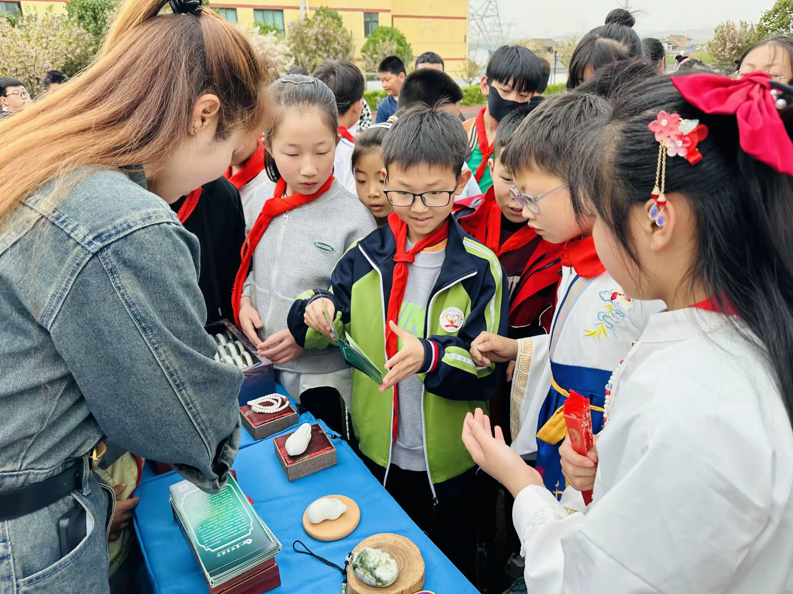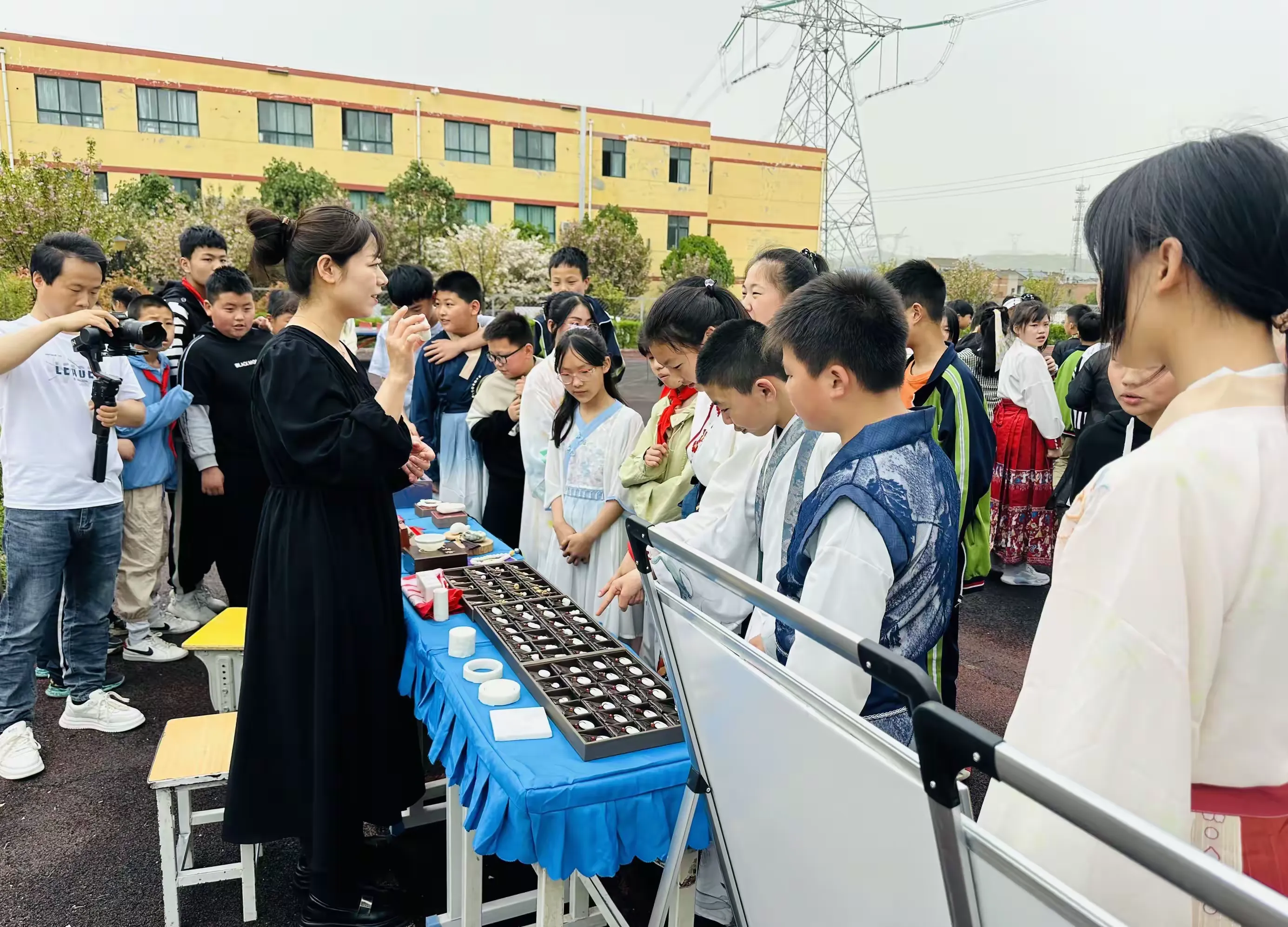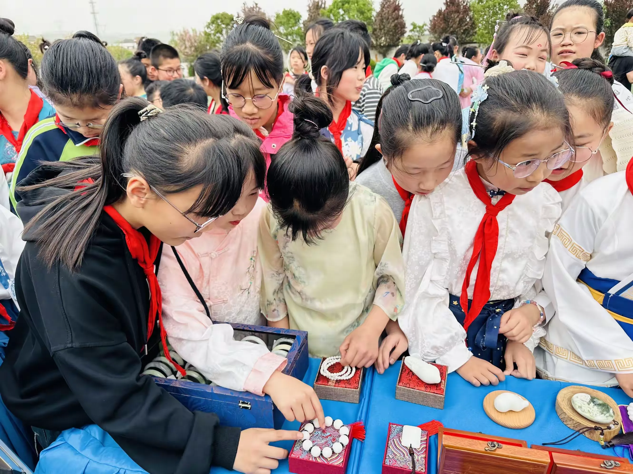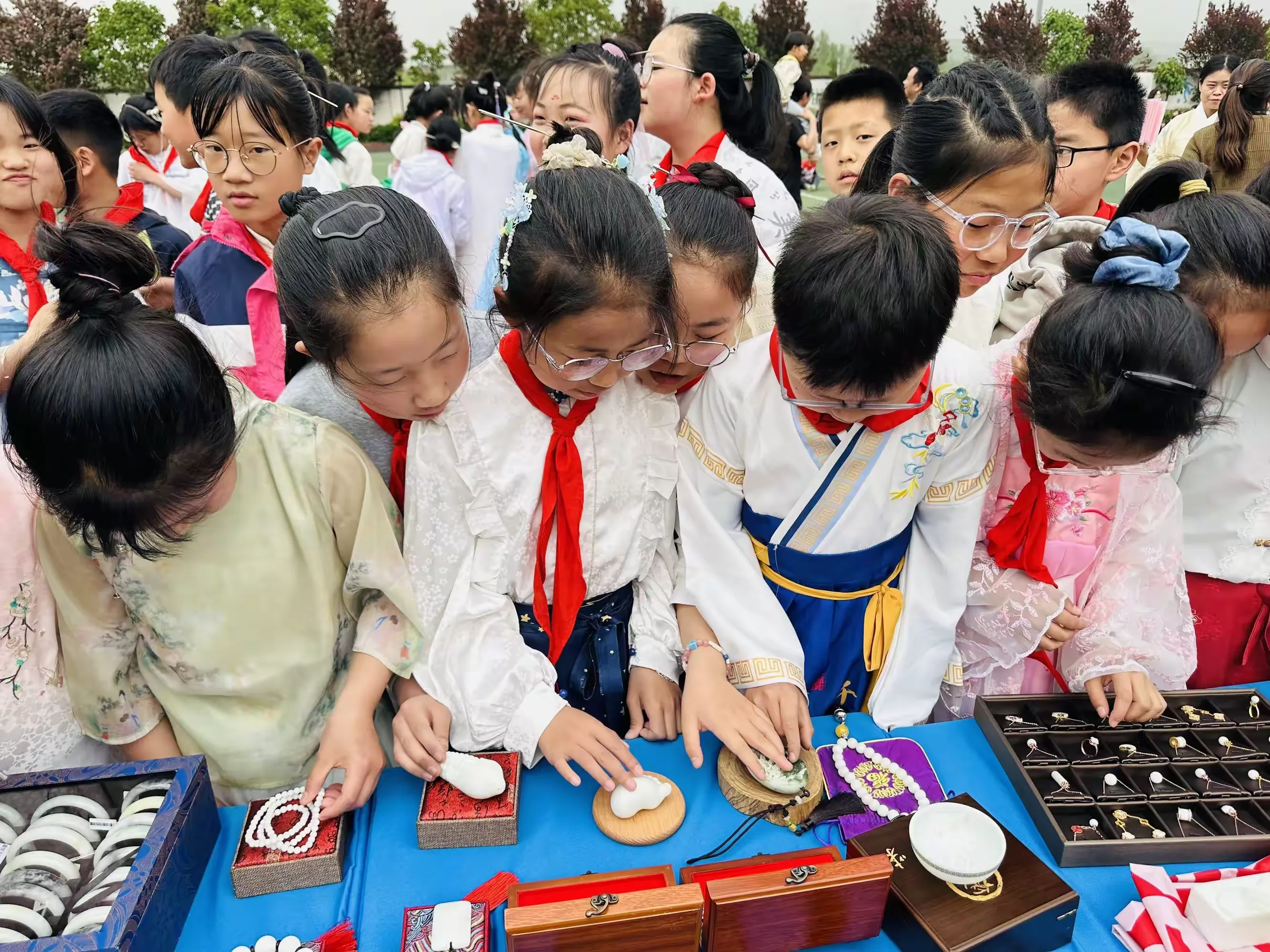 同学们在老师的组织下,穿着汉服,积极整理好队形,准备开始今天精彩丰富的活动,感受汉服文化与玉文化的碰撞。
