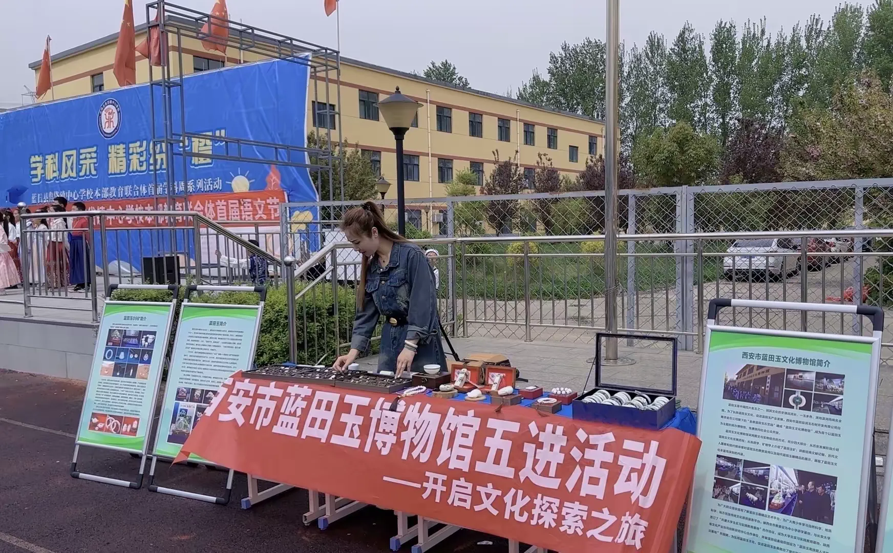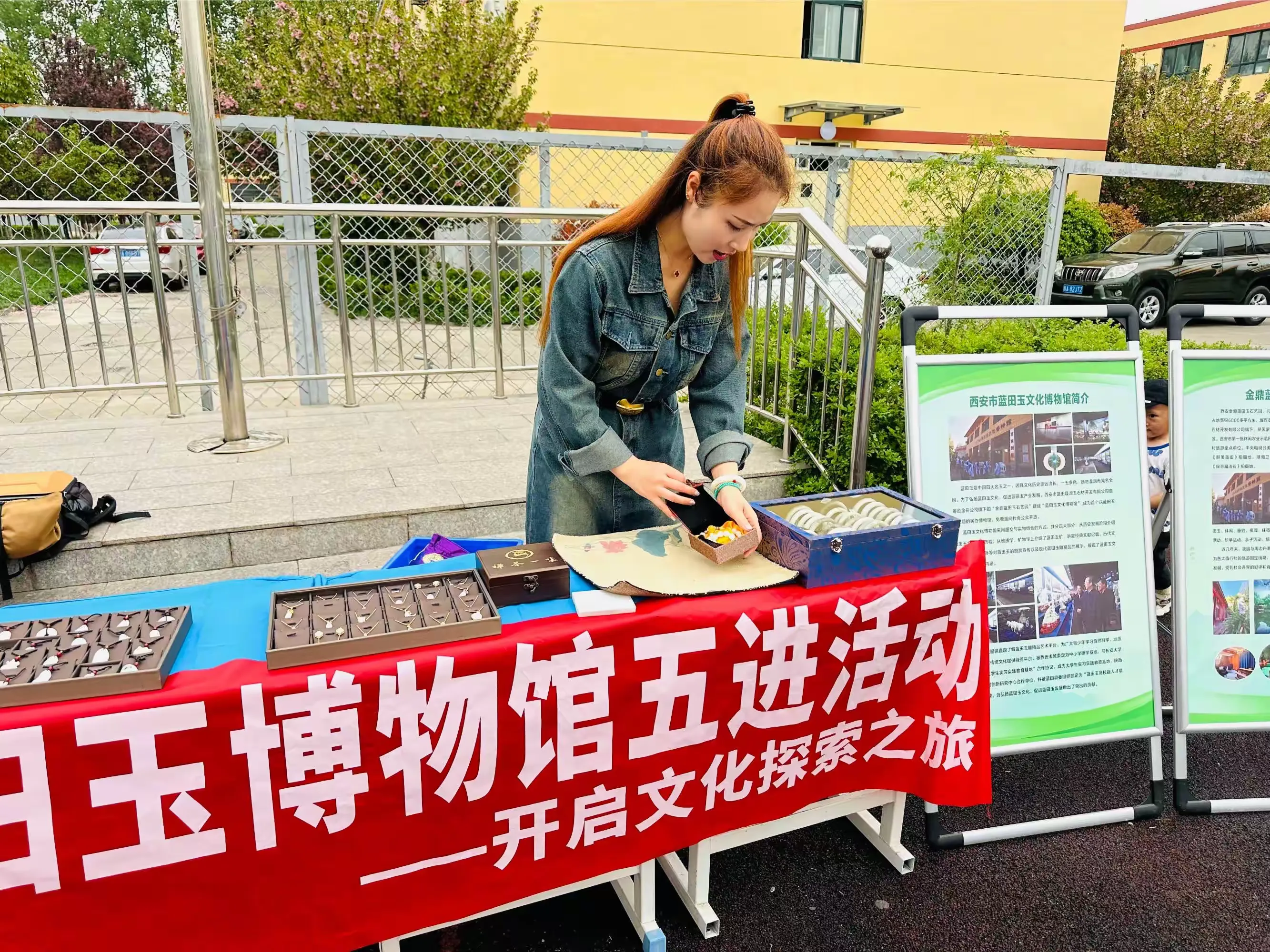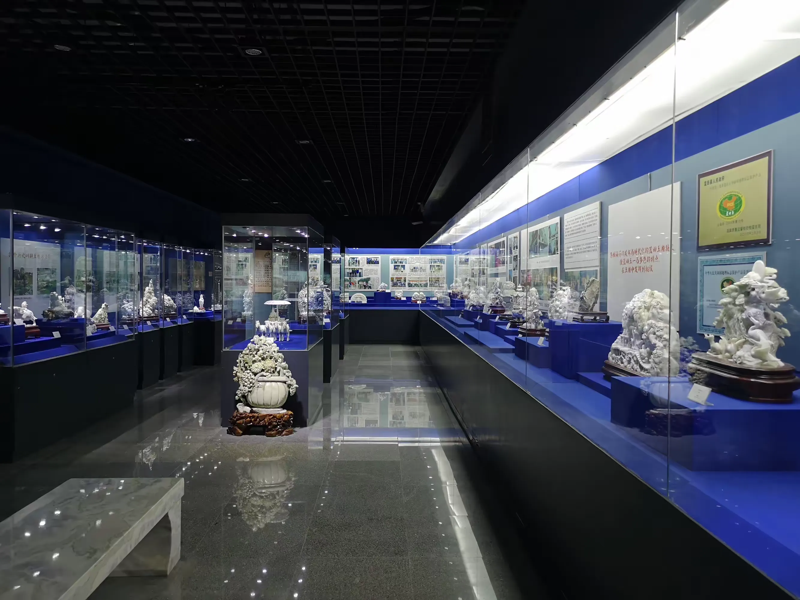 我们做了蓝田玉文化博物馆简介、蓝田玉矿简介、蓝田玉历史简介等的展板陈列。布置了文创产品展台,陈列展示蓝田玉手镯、吊坠、镶嵌款饰品、手串、印章等文创产品。